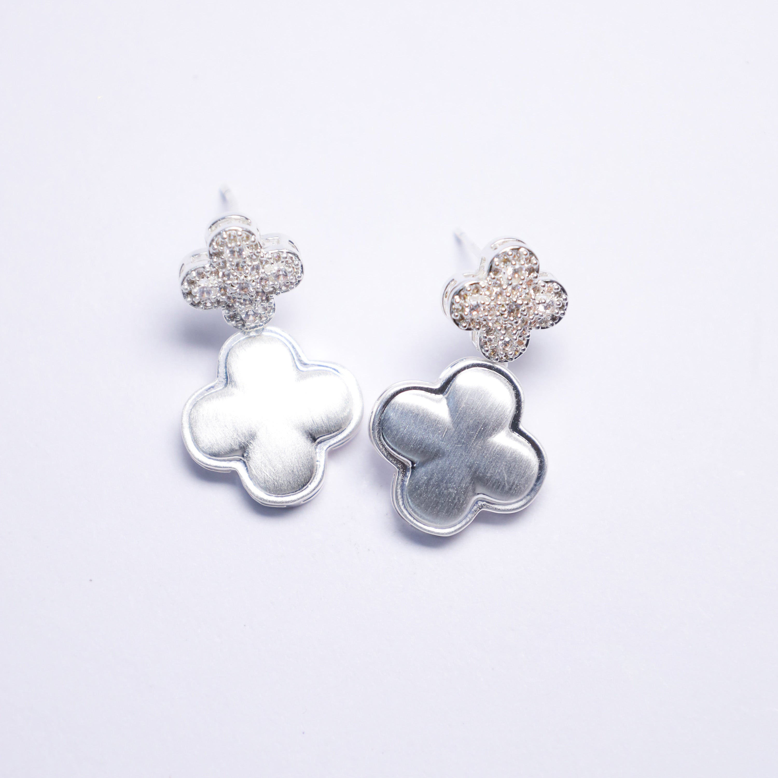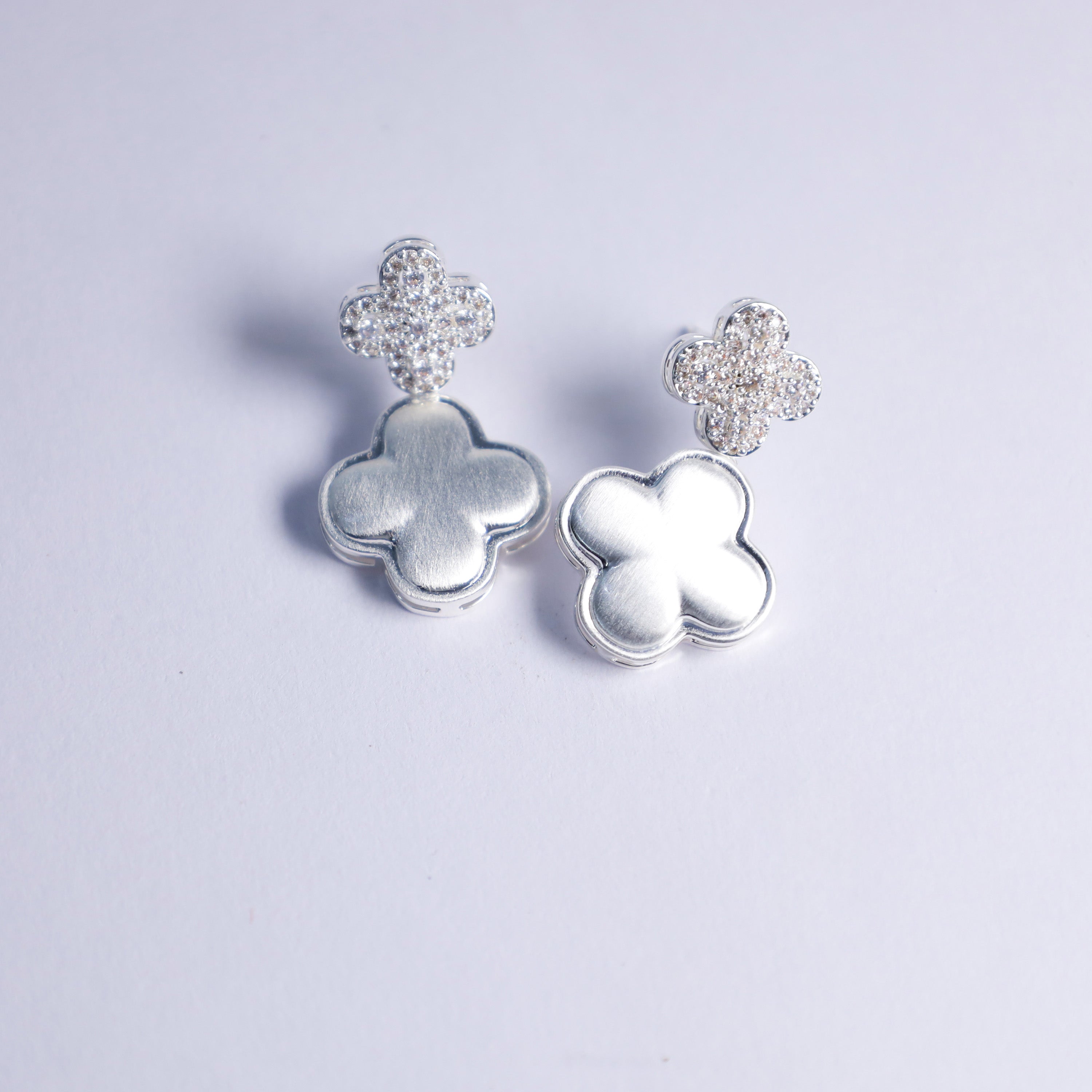Delicate clover-shaped clusters adorned with shimmering stones catch the light beautifully.